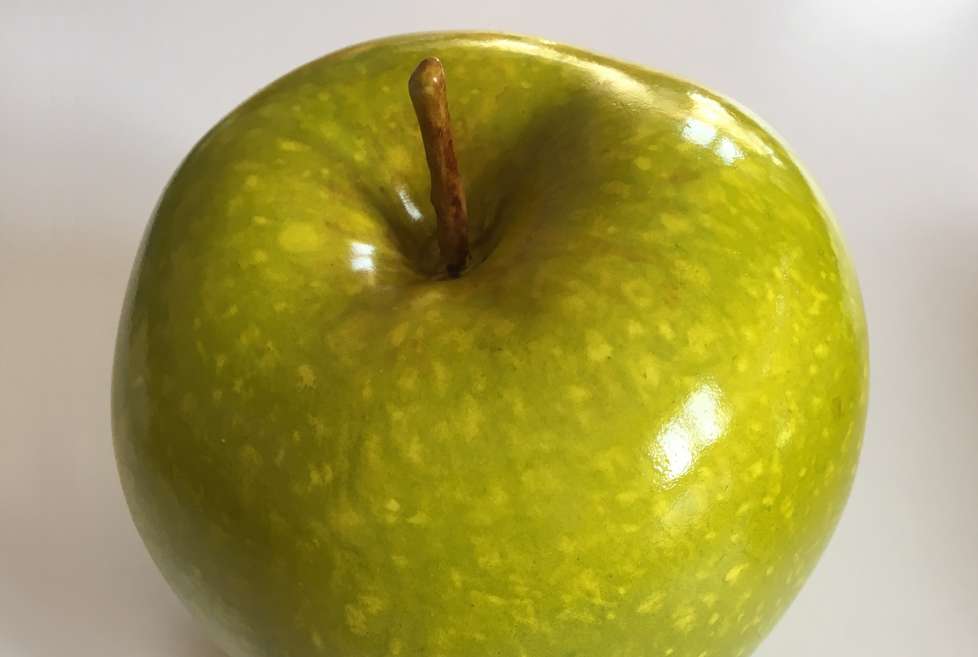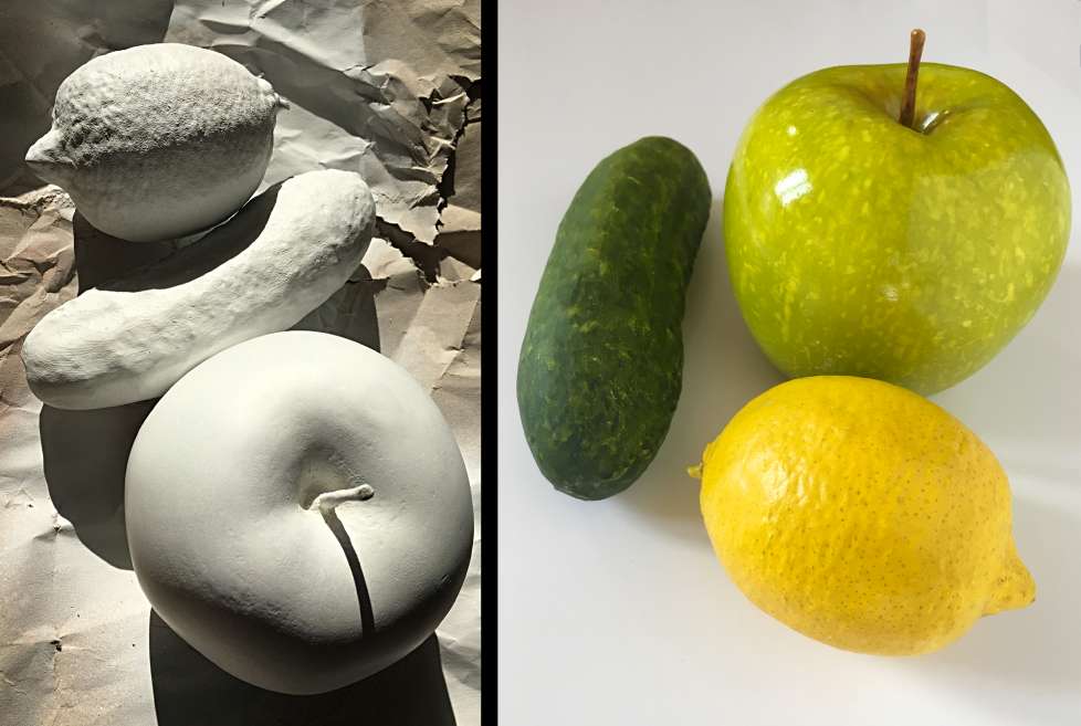 J'apprête les 3 impressions 3D et ponce les petits défauts apparents. C'est la partie qui prends du temps mais qui va aussi conditionner la suite de la peinture. J'entame alors la colorisation à l'aérographe avec une approche en hyperréalisme suivant la demande faite. Le cornichon est verni en mat, le citron en verni satiné et la Granny Smith en brillant. Le résultat est là, et la pomme Granny Smith est superbe, avec les compliments appuyés de Louis Vuitton.