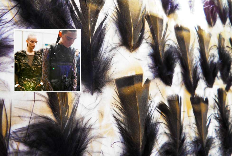 Appelé à peindre en couleur or des plumes de coq, par la société Lemarié pour un défilé Chanel, cela n'est pas courant, et s'annonce étonnant. Le support est totalement différent de tout ce que j'ai fait auparavant. La réalisation à l'aérographe doit être rendue pour le défilé Chanel et les plumes doivent être montées et cousues sur les vêtements .