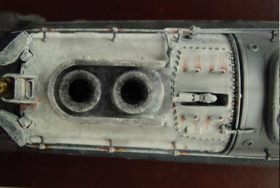 Je récupère la locomotive ... enfin! . À mon tour. Une relecture des deux livres et je démarre. Je travaille à l'aérographe à turbine car c'est le plus fin pour ce type de mise en couleur. J'invite le possesseur de l'engin à venir et à finaliser ensemble cette mise en couleur hyperréaliste. Aprés quelques jours de peinture, le résultat est là avec même des reflets bleus légers pour simuler la graisse des bougies.