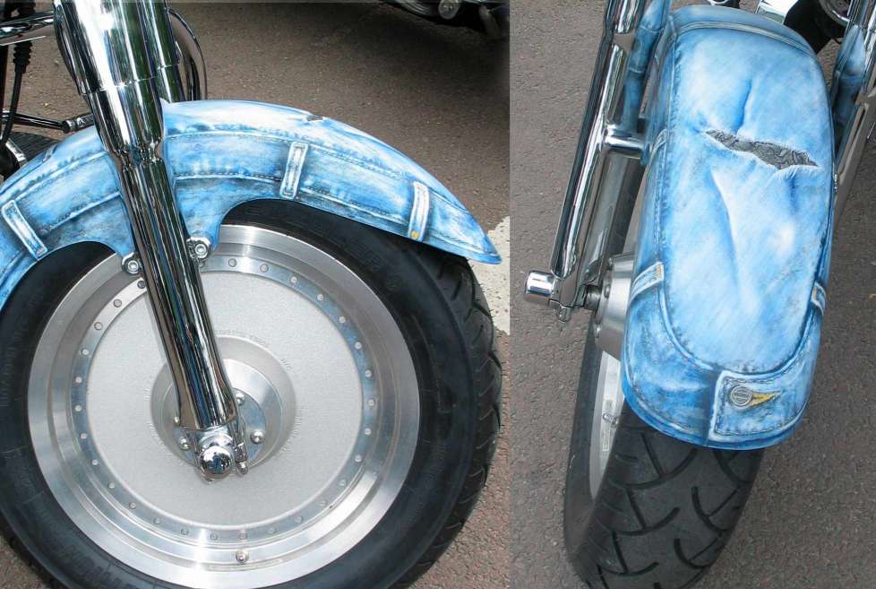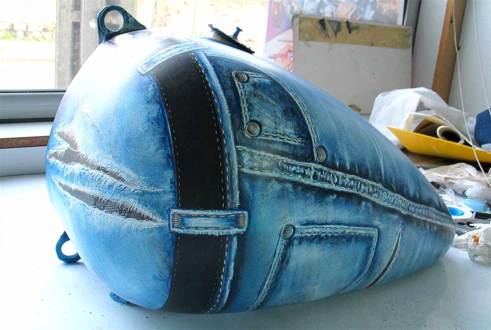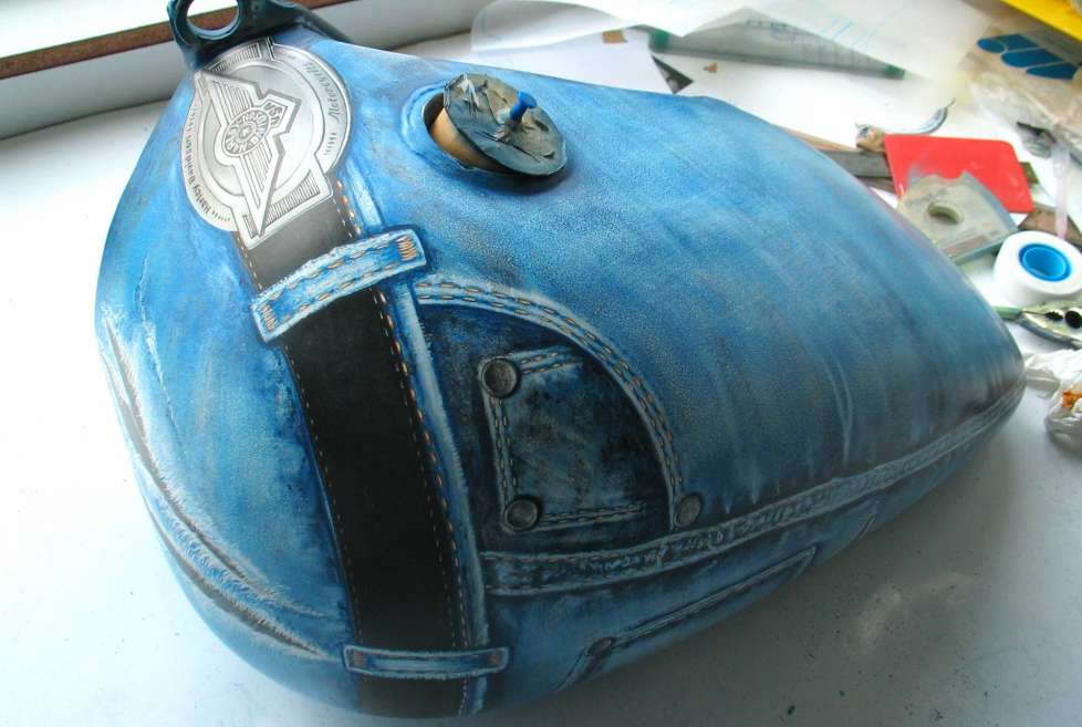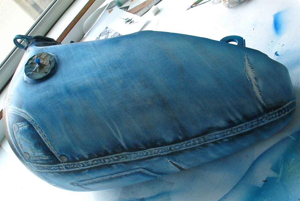 Je met en pratique ma réflexion et arbore une texture jean 3 heures après sur le premier réservoir. Le travail à l'aérographe peut réellement démarré . La couleur bleu-jean trouvée ainsi que le jaune couture, la peinture à l'aérographe commence. C'est par les deux réservoirs iconiques en Blue jean que la moto s'habille. Les deux garde-boue suivent le même procédé. Après les dernières vérifications d'usages, les éléments de la moto passent chez le carrossier pour le vernis brillant.