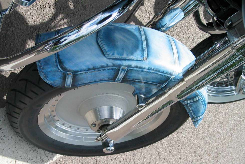 Changement de temps, de situations personnelles, de ressentis, c'est sur un motif de jean que Sylvie se dirige maintenant. Elle aime rouler avec ses amis "on the road " et s'habille souvent en Blue jean pour être à l'aise. Travaillant dans une boutique de lingerie féminine, elle garde sa féminité dessous et veux la même option sur sa moto. C'est chose faite, avec à travers un jean déchiré, un dessin de dentelle. Il faut tourner autour de la moto pour découvrir les motifs cachés.