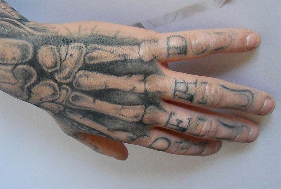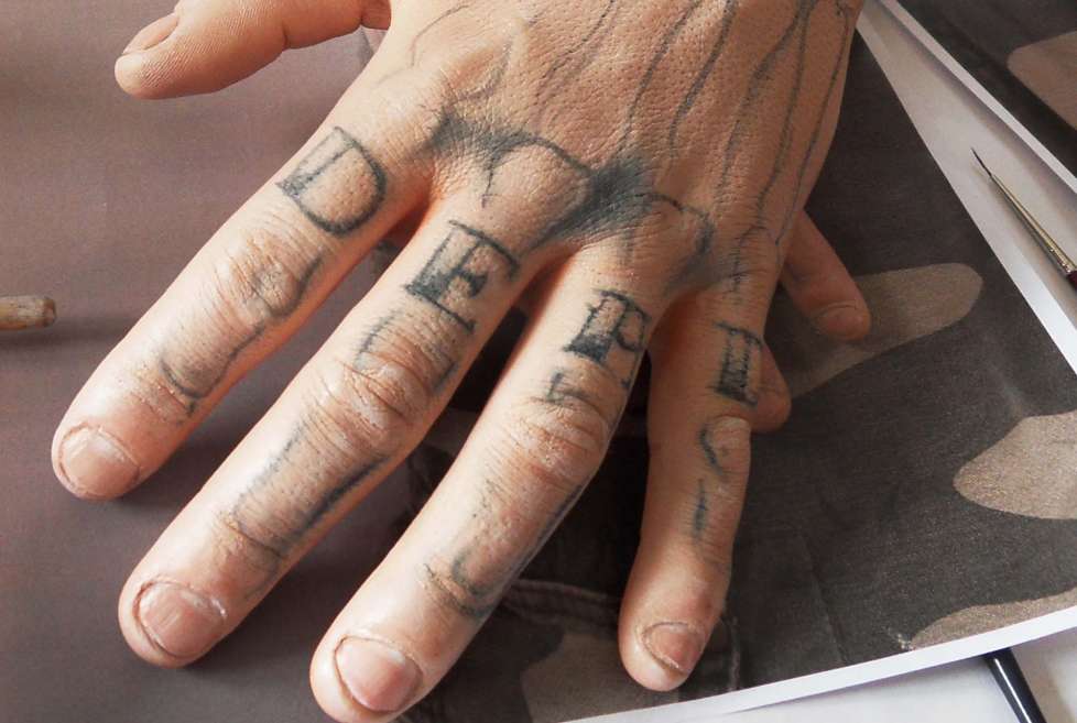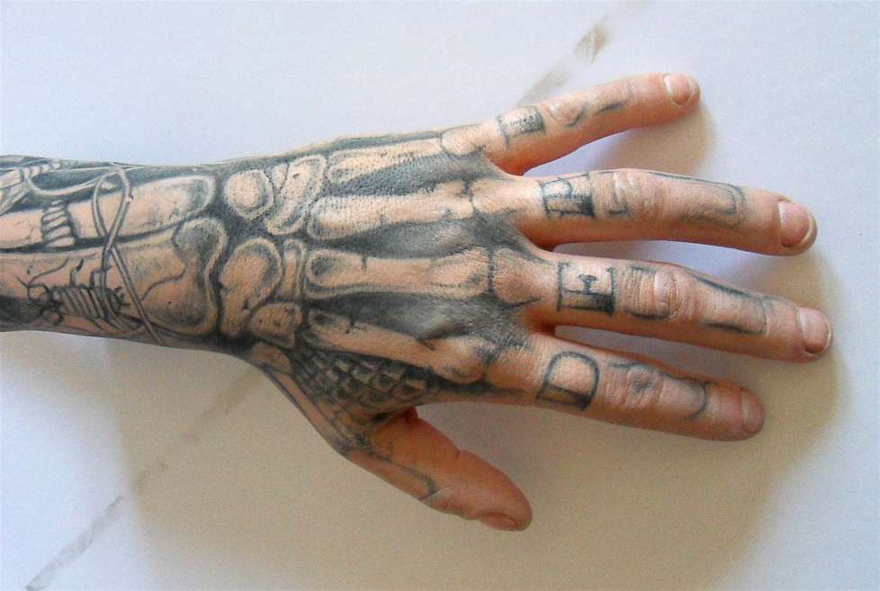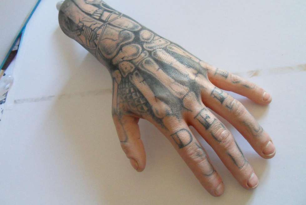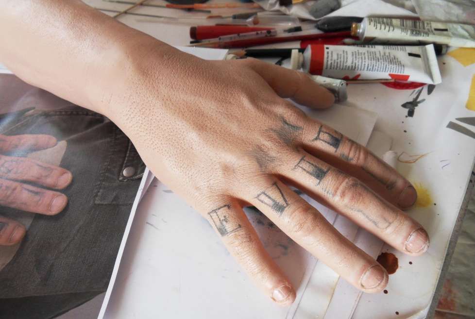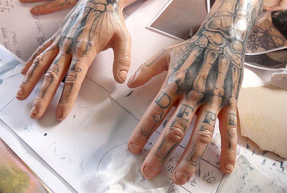 On me donne de la documentation sur les tatouages de ses mains à réaliser. Je récupère donc les deux éléments à peindre, et arrivé à l'atelier, je dois réfléchir à la manière dont je vais me poser dessus.