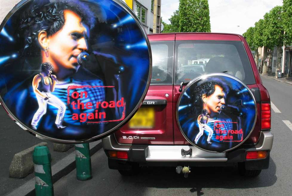 Protège pneu 4X4 : Un rêve enfin réalisé pour ce propriètaire de ce 4X4 . Avoir sur son protège pneu son idole de toujours ... Bernard Lavilliers