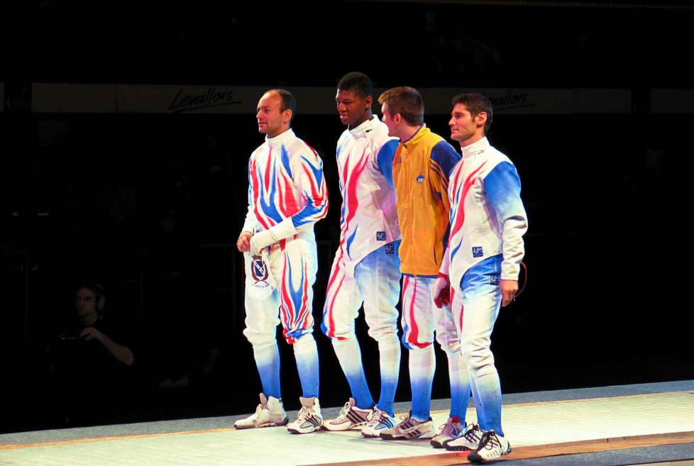 Xavier BOULLY : Oui !! Masque, veste et pantalon cela faisait un bel ensemble. Ensuite l'année suivante, le bleu blanc rouge est revenu sur les tenues mais d'une manière beaucoup plus artistique avec en prime des dégradés de couleurs bleus sur la jambe de pantalon, la manche de veste et... les chaussettes. Les escrimeurs étaient étonnés et en même temps séduit par cette approche nouvelle. La troisième était vraiment classe!! Pour la dernière coupe du monde des clubs à l'épée en 2004, nos escrimeurs avaient gagner les jeux olympiques. Pour la recherche de couleur sur la tenue après maints recherches, je décide d'honorer la tenue de Levallois par la couleur OR, en clin d'oeil a Hugues OBRY. Superbe !! Ma préférée sur le plan travail. Je ne sais pas si j'ai porté chance, mais à chaque fois Levallois a gagné. Au niveau visuel tant sur le plan photos que vidéos et télévision, il n'y a aucune comparaison. L'attrait que procure la couleur sur la tenue est époustouflante. Quand on voit ces champions en mouvement c'est magique!! Cela a permis de nombreuses photos ainsi que de belles retransmissions à la télévision.
