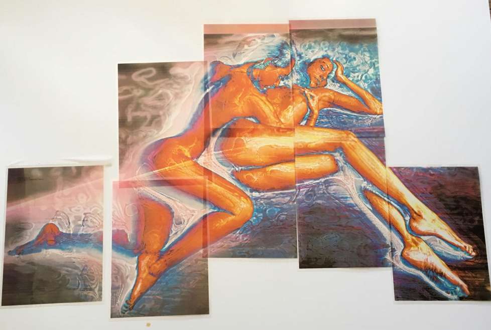 Etape 1: Conception maquette sur ordinateur. Ceci n'est qu'un support sur lequel je ne m'appuie qu'au départ de la toile. Aprés avec la peinture, c'est un autre duo qui se forme ou l'improvisation, les erreurs et de nouvelles idées peuvent arriver en cours d'éxecution. Rien n'est figé à ce stade là, et trés souvent le processus de ma création reprend le dessus.