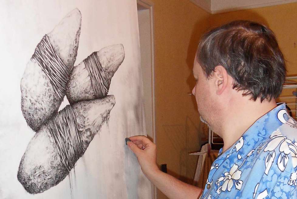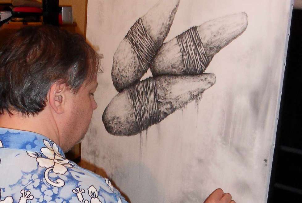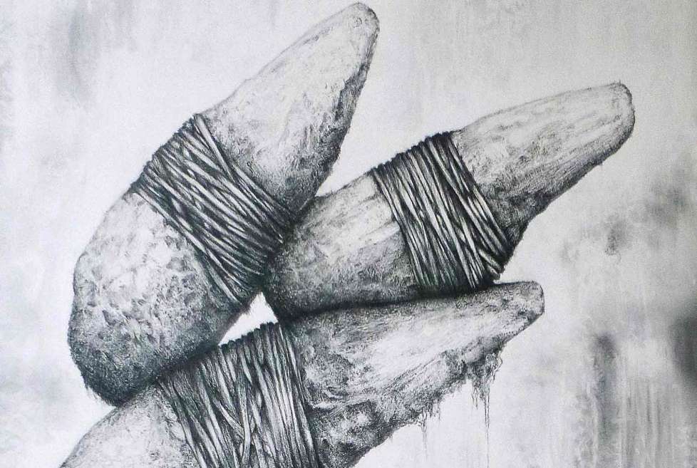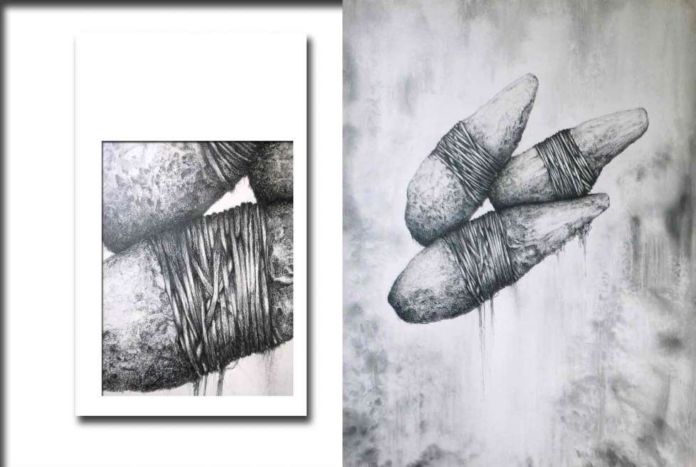Toile réalisée avec des mines graphites de duretées différentes : 2H-HB-2B-3B-4B-8B et gommes diverses pour effet et repentir sur toile apprétée en différentes couches de Gesso, et poncées entre.