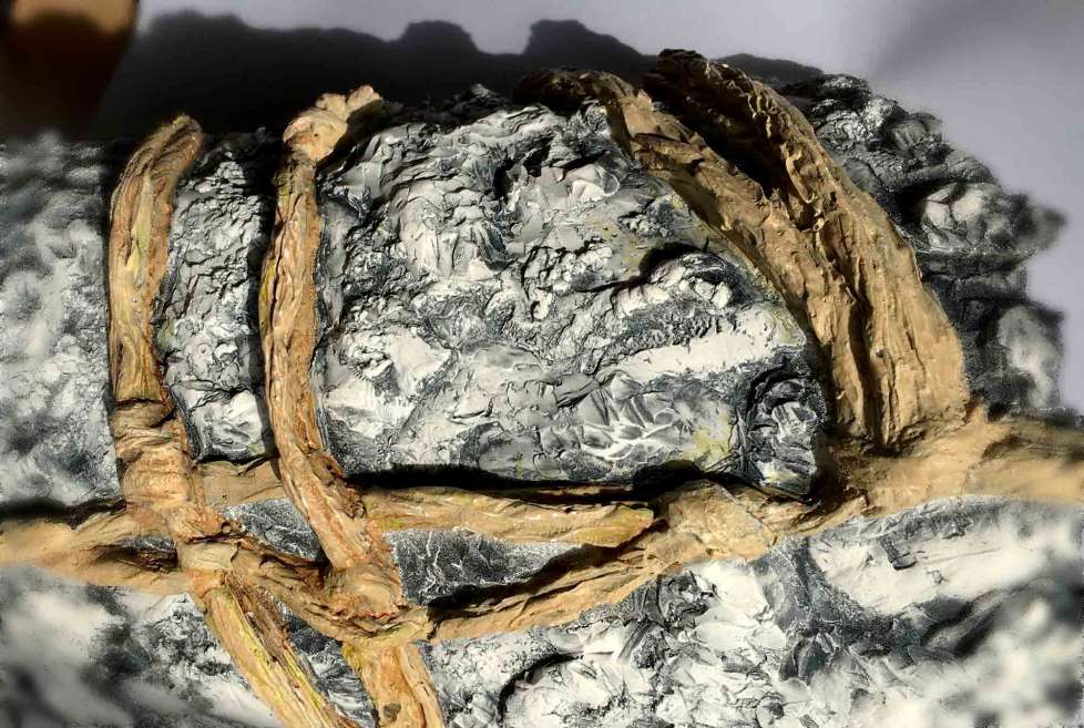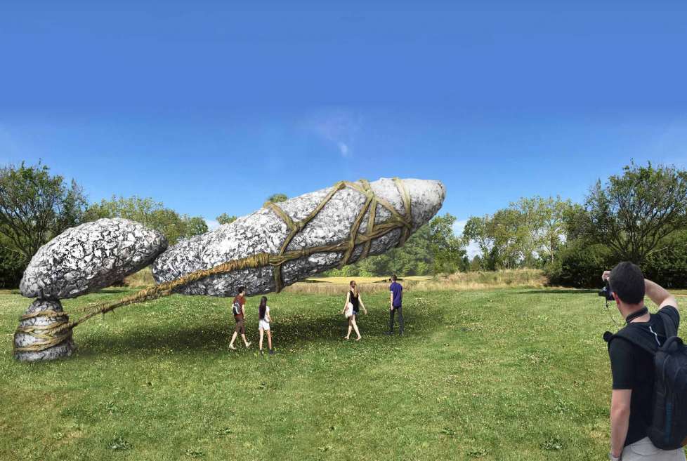 On peut imaginer des herbes et de la mousse recouvrir partiellement le rocher permettant un effet d'adéquation avec la nature, et des oiseaux se poser dessus pour y nicher .