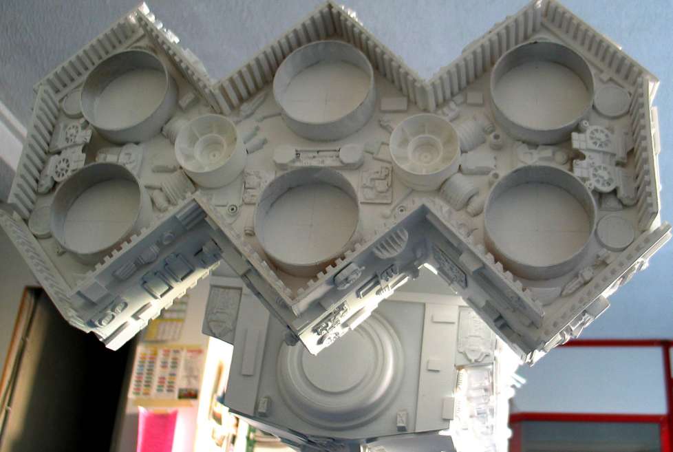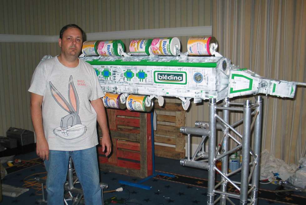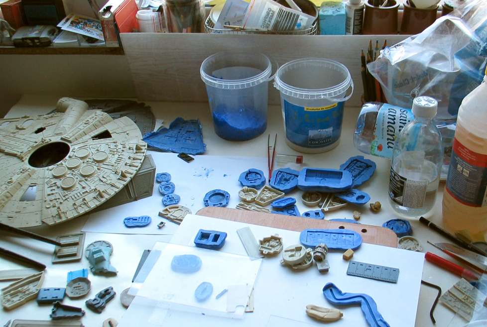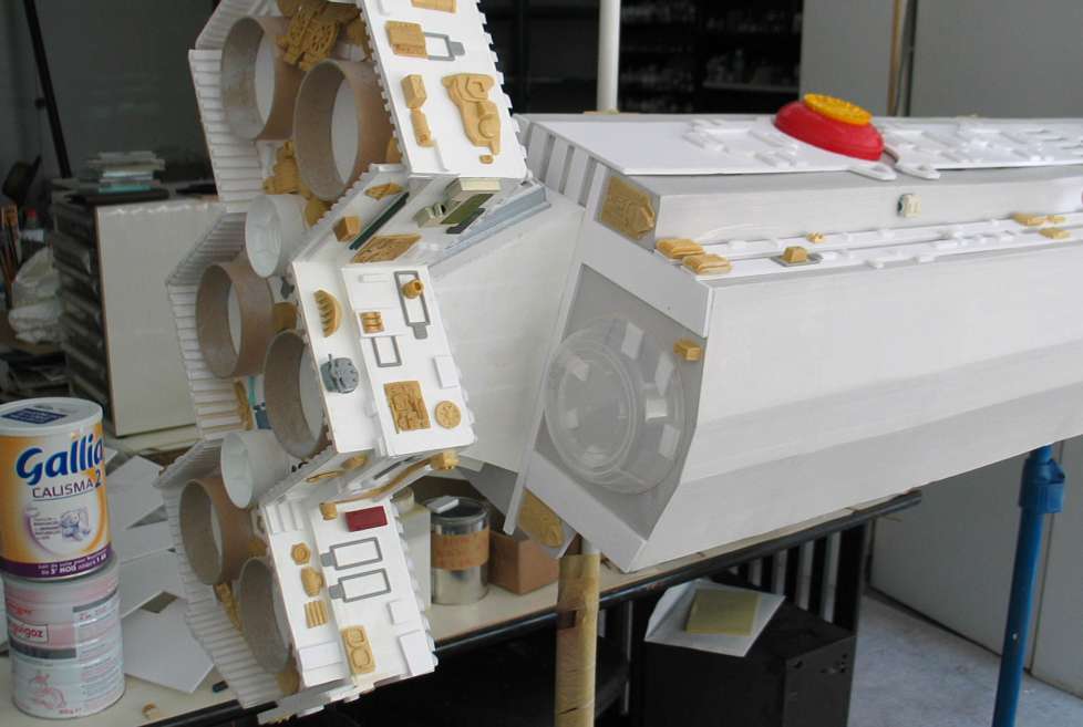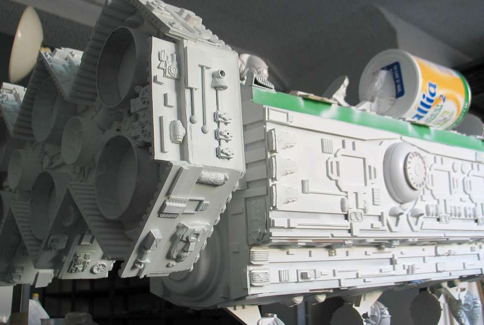 Je tiens mon STAR WAR ! Mon rêve se réalise. Michel mon ami construisit la base et l'enveloppe du vaisseau et je m'occupe du reste. Les détails fait de tirages en résines polyuréthane et de mon stock de pièces détachés d'ancienne maquettes habille l'ensemble. La peinture et les effets de weathering (salissure) ajoutent une véracité au vaisseau Blédina transportant à son bord les packs de lait à travers la galaxie…